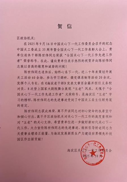 海淀区关工委为海淀区政协送上贺信,感谢区政协对关心下一代工作的高度重视及对“五老”的关心支持。