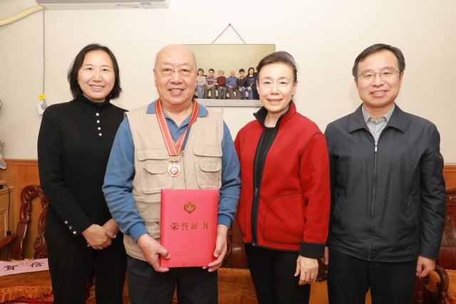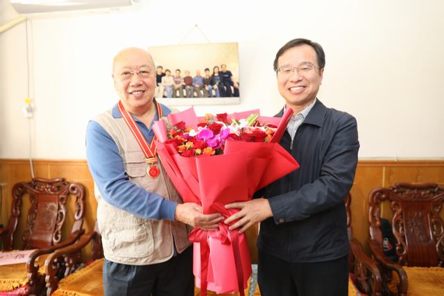 刘恪为陈世伟颁发荣誉证书和奖章,张启兵献花表示祝贺。