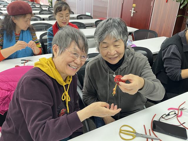 实践操作环节中,老干部们手持特制工具,在李彤老师的耐心指导下,有条不紊地进行盘绕、定型、点缀等操作。彩线在指间灵活穿梭,经过一番精雕细琢,一枚枚寓意“福寿双全”的精致盘扣相继成型。活动尾声,老干部们将亲手制作的盘扣精心镶嵌于相框之中,定格美好瞬间,留下专属纪念。