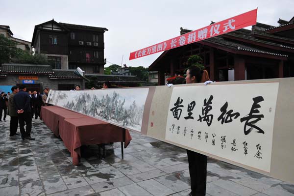 在长征胜利80周年之际,4月26日,海淀区委宣传部、海淀区文联向位于贵州省习水县土城镇的四渡赤水纪念馆捐赠了60米山水长卷《长征万里图》。