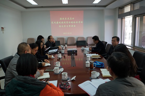 12月15日,史志办召开党风廉政建设责任制检查考核工作部署会。会议总结了前段时间党风廉政建设责任制检查考核工作,对照考核体系,认真查摆问题,汇总工作经验,迎接检查考核工作。依照考核要求,会议组织人员继续学习《中国共产党党内监督条例》《中国共产党问责条例》及中共北京市委实施《中国共产党问责条例》办法,深化理解。