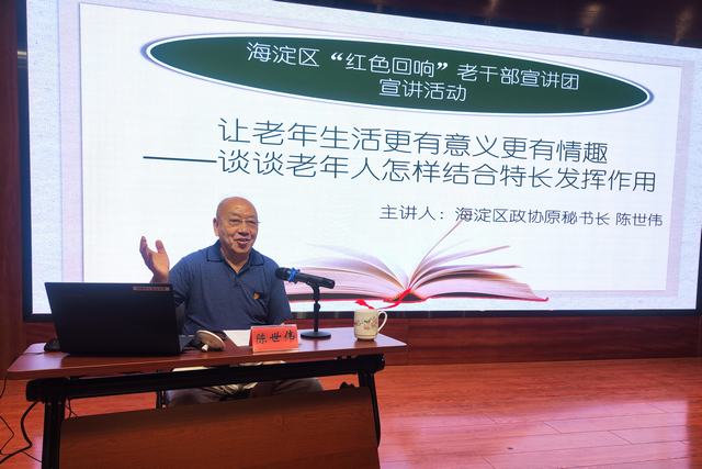 5月18日,85岁的宣讲团成员、区政协原秘书长陈世伟与北太平庄街道文慧书院的广大离退休干部分享《让老年生活更有意义更有情趣——谈谈如何结合特长发挥作用》。他以幽默风趣的口吻向听众娓娓道来退休后的心路历程、兴趣爱好、志愿服务等故事,以“身、心、能、勤、和”为总结,鼓励老同志们保持乐观和健康,持续发挥银发作用。现场听众积极发言交流,倍受鼓舞,表示将以陈世伟同志为榜样,保持正能量的身心状态,坚持老有所为。