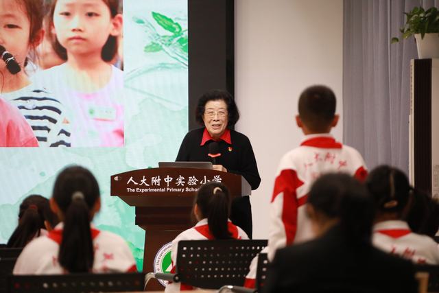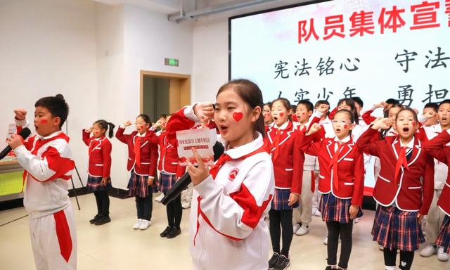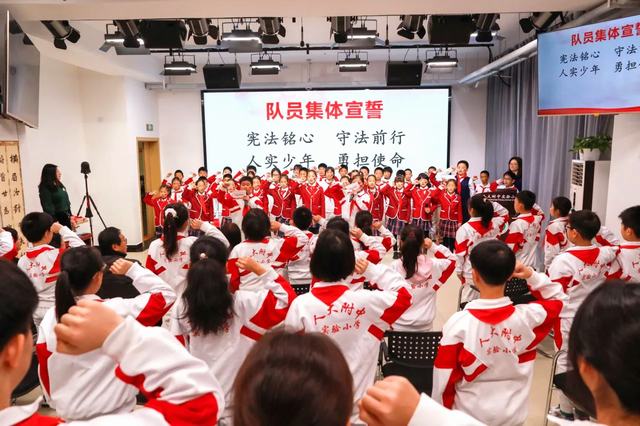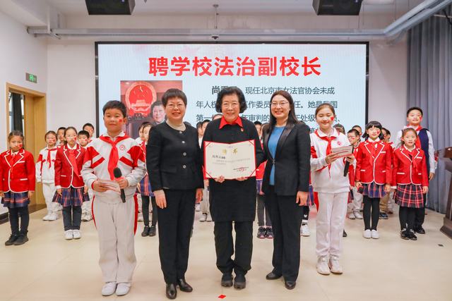 区人大附中实验小学的王振惠书记、张冬梅校长为市“五老”法治工作团成员、海淀区“五老”代表、“法官妈妈”尚秀云颁发聘书。少先队员们用“宪法铭心,守法前行;人实少年,勇担使命”誓言表达了尊崇、守护、传承、弘扬宪法精神的坚定信念。