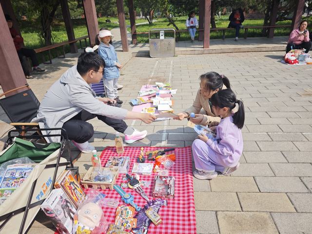 活动当天,15张地毯依次排开,组成热闹的跳蚤市场。孩子们抱着玩具车、绘本穿梭在摊位中,兴奋地与小伙伴交换“宝藏”;爸爸妈妈们忙着挑选高性价比的闲置好物,不时交流育儿经;几位手工达人的摊前围满人群,布艺饰品、手绘书签等文创作品颇受青睐。现场各类商品应有尽有,稚嫩的叫卖声此起彼伏,热闹非凡。
