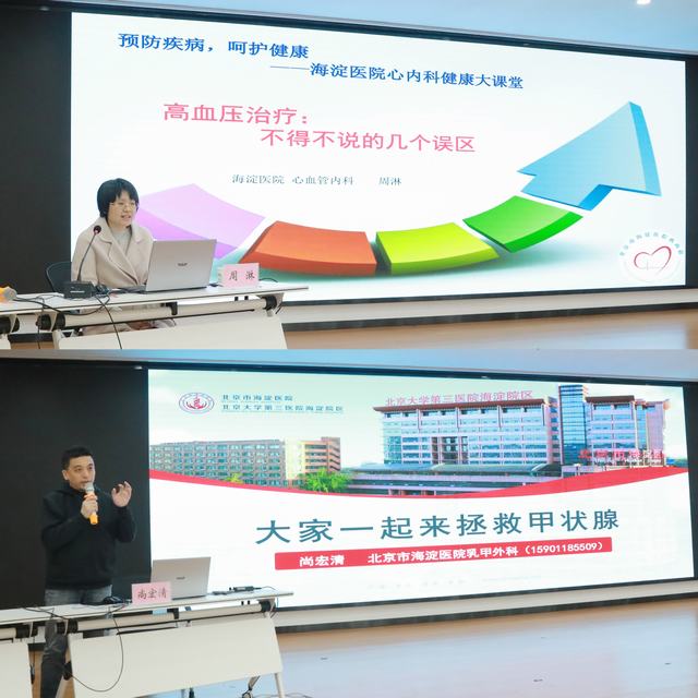 在健康科普讲座环节,海淀医院乳腺甲状腺外科尚宏清主任医师、心血管内科周淋副主任医师分别围绕甲状腺结节、高血压管理两大主题开讲。两位专家全程采用通俗易懂的语言,不仅深入解析两类疾病的成因与认知误区,更从“防、治、康”全链条管理角度,详细讲解日常生活中通过饮食调整、科学运动、情绪调节降低疾病风险的具体方法,同时结合老年群体生理机能、生活习惯等特征,提出针对性的健康建议,帮助老干部们全面提升健康管理意识与实操能力。