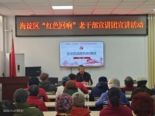 为深化爱国主义教育、推动红色文化进基层,11月21日上午,海淀区“红色回响”老干部宣讲团走进花园路街道防化社区进行宣讲。宣讲团成员齐勇以《纪念抗战胜利80周年》为题开展专题宣讲,花园路街道党员近百人参加。