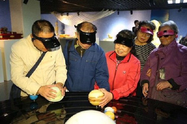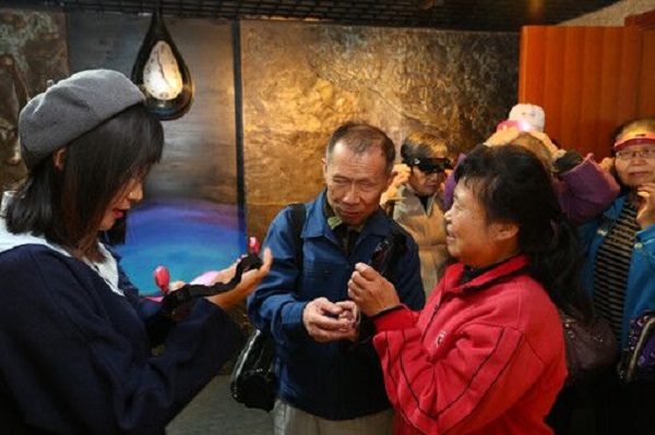 大家先行参观了盲文社科区、有声读物区,参与了视障文化体验、触摸博物馆等互动活动。在参观体验活动的过程中,盲人朋友们聚精会神地聆听解说,仔细地触摸场馆内的各种盲人辅具和实物,与工作人员和志愿者亲切交流,最后还体验了口述电影《我的前任3》。专业的电影场所,专业的盲人电影解说员,将电影的故事情节、主人翁的衣着打扮以及变换中的场景等,进行声情并茂的同步讲解,让盲人朋友如临其境,如见其人。