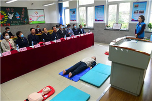尹会长一行首先来到北京科技大学附属中学,参观红十字教室,实地了解学校红十字工作开展情况。学工委负责人及王世东校长详细介绍了海淀区红十字青少年工作及科大附中红十字青少年及应急救护工作开展情况,教师现场展示心肺复苏操作及自动体外除颤仪(简称AED)使用。