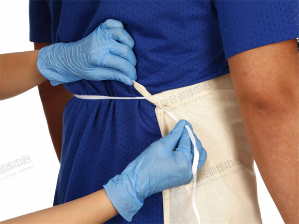 6. 将两燕尾角向上提起覆盖前胸和后背,在健侧肩部打结。