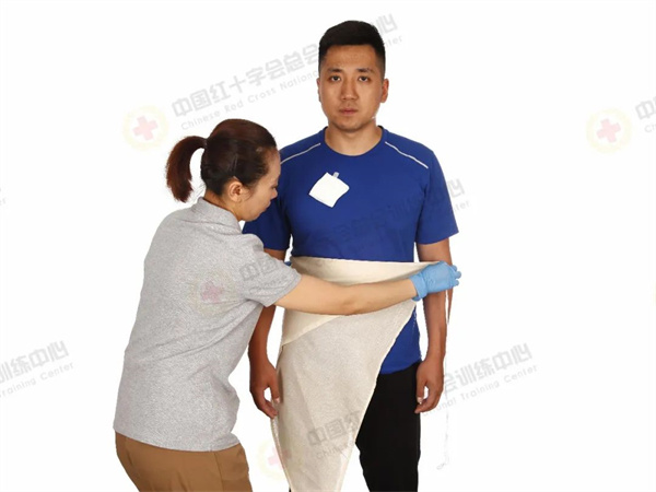 3. 底边向上反折至肋弓下方围绕胸部至背部,两底角在后背健侧打结。