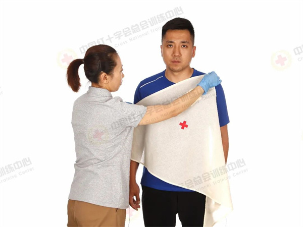 2. 将三角巾展开,顶角置于伤侧胸部的肩上,覆盖伤侧胸部。