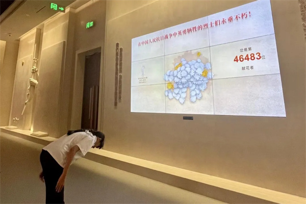 历史是最好的教科书,来自石油大院志愿家庭服务队的小程同学在了解那段波澜壮阔的抗战历史后深受触动,在电子献花墙前深深鞠躬致敬。