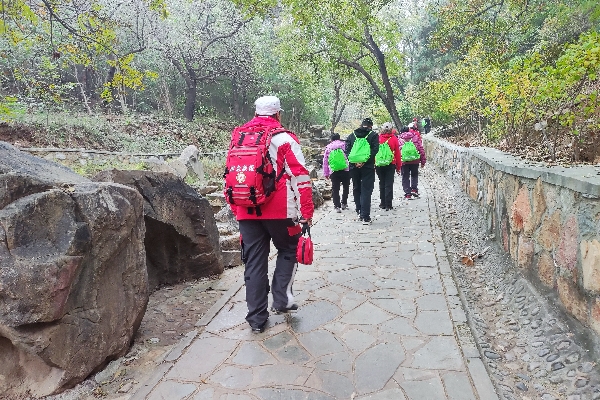 随着活动正式开始,参加登山的人员从西山国家森林公园门口出发,沿着左侧道路直行,一路金黄色的秋景,一直延伸到森林大舞台。这条全程约2公里的徒步路线,景色宜人,但也不乏一些具有一定挑战性的路段,期间有位老人突发身体不适,心慌无力,脸色苍白,红十字海蓝救援队的队员们迅速响应,待体征平稳后护送下山,其他队员分散在队伍的前后和两侧,密切关注着每一位登山者的状况。