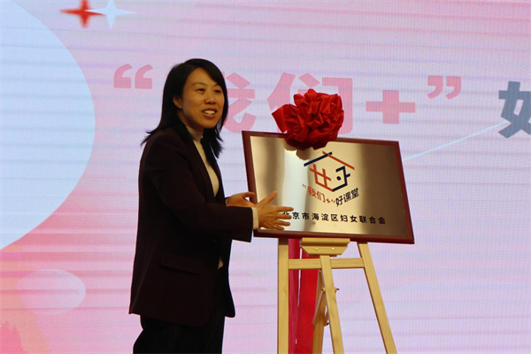 柳阑主席为“我们+”好课堂揭牌,并分享LOGO的寓意:科技蓝与温暖粉的组合,构建出家的屋檐,既蕴含“女子”的巾帼之力,也搭建出“我们家好”的美好期待。