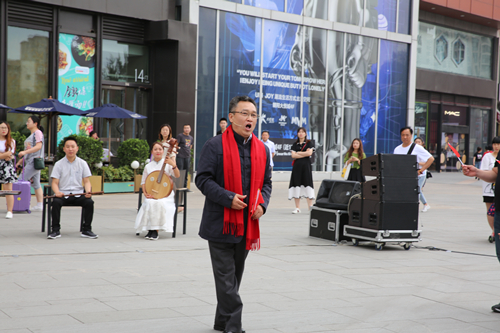 下午16时,朝阳大悦城正门广场,宛转悠扬的古琴声传来,沈乐年、赵亚洲、陈丽苹等会员代表在人群中共同领唱《我和我的祖国》主旋律,随后,所有会员代表组成歌唱队伍,从四面八方汇集到广场中央,用歌声真情表白祖国70周年华诞。动人旋律回荡在广场,突如其来的歌声吸引住过往的人流,民建会员向观众和路人们分发了早已准备好的小国旗,鼓励大家一同加入活动。过往的青年人停下了匆匆的脚步,肃立吟唱,这是精神的感召;小朋友们勇敢地走到演唱队伍前,歌声清脆,仿佛祖国的花朵急切地渴望开放;还有老年人加入到活动中,他们目光如炬,声音绵延洪亮,那是信仰的力量。民建会员带领大家聚拢一起,同心同向,现场浸润在掌声和五星红旗的海洋之中……