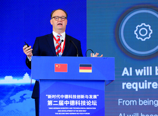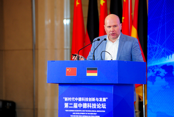刘恪同志代表海淀区致辞,对欧美同学会、市欧美同学会的信任和支持表示衷心的感谢,并介绍了海淀区在历史文化、科学教育资源、“高精尖”经济结构、人工智能发展等方面情况。同时希望中德两国科学家、企业家以及各类专业人士能借助论坛开展思想碰撞、技术交流和跨界融合,推动未来科技快速、健康、可持续发展。