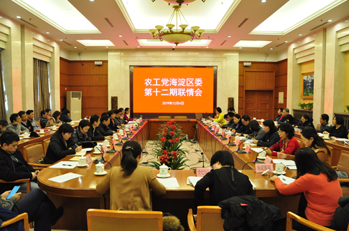 2019年12月4日,农工党海淀区委在中国林业科学研究院报告厅西厅举办第十二期联情会。农工党北京市委专职副主委李亚兰、中共海淀区委统战部副部长王选革和国家卫健委、西苑医院、北京大学等15个单位的中共党委领导应邀出席。区委主委徐凤芹,副主委吴敏华、曹卫东、张盼月、于逢春,专职副主委胡敏健和区委各基层组织负责人参会。会议由段新芳副主委主持。