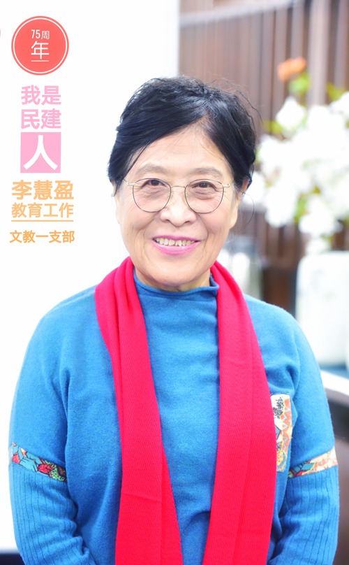 李慧盈,民建海淀区文教一支部会员,1985年加入民建,退休前从事教育工作。曾任民建海淀区文教支部主委、民建海淀区工委委员、民建海淀区委委员。现任民建海淀区委老年委员会主任。