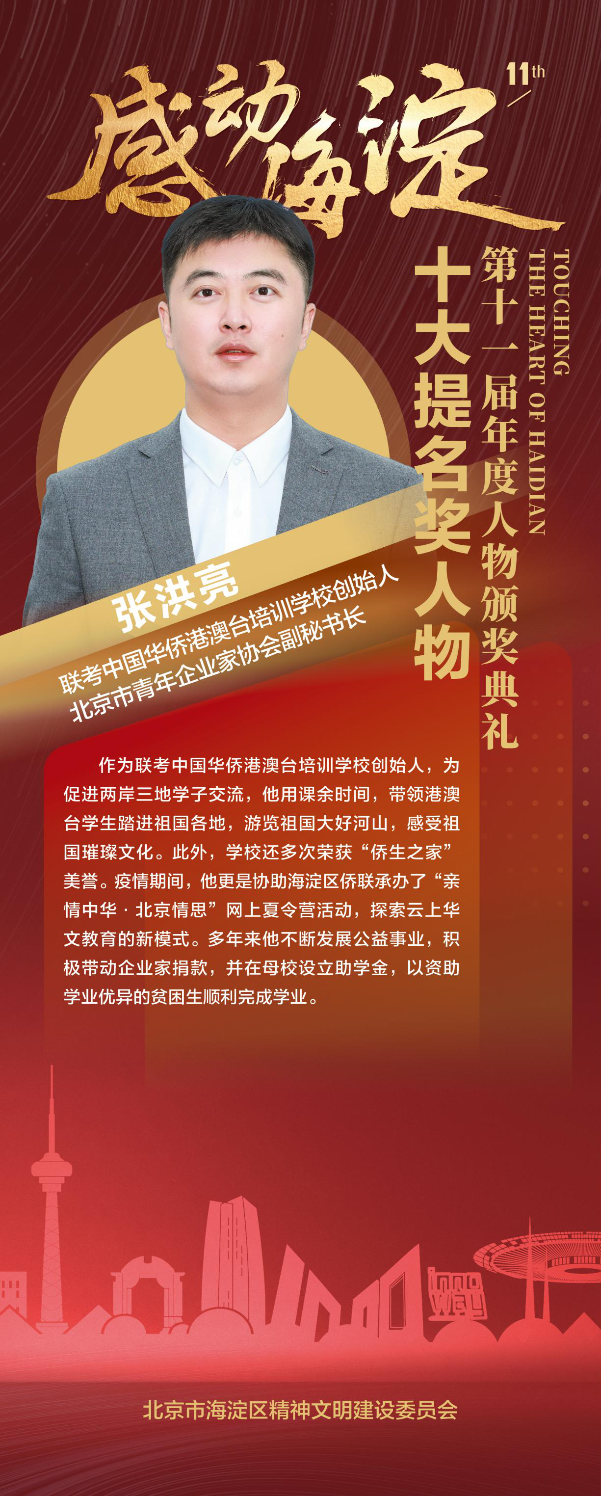 张洪亮同志于2008年创办联考中国华侨港澳台培训中学校,累计培养帮助几千余名华侨港澳台学子成功考取国内名牌大学。同时,为了让海峡两岸|内地和港澳台学子更好地感受祖国温暖,张洪亮同志充分利用课余时间,带领学子踏进祖国各地,游览祖国大好河山,感受祖国璀璨文化,疫情期间更是协助海淀区侨联承办了“亲情中华·北京情思”网上夏令营活动,探索云上华文教育的新模式。在他的带领下,学校多次荣获“侨生之家”的美誉,并积极为中华两岸交流促进会、香港专业人士(北京)协会等青年社团提供活动场地、经费支持,促进华侨港澳台学子交流交往。张洪亮同志还坚持公益事业,积极带动企业家捐款,并在母校设立助学金,资助优异贫困生顺利完成学业。
