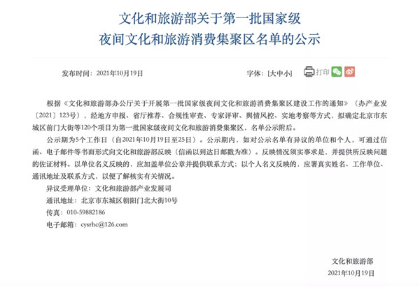 10月19日,文化和旅游部发布了第一批国家级夜间文化和旅游消费集聚区名单。经地方申报、省厅推荐、合规性审查、专家评审、舆情风控、实地考察等方式,拟确定北京市东城区前门大街等120个项目为第一批国家级夜间文化和旅游消费集聚区。