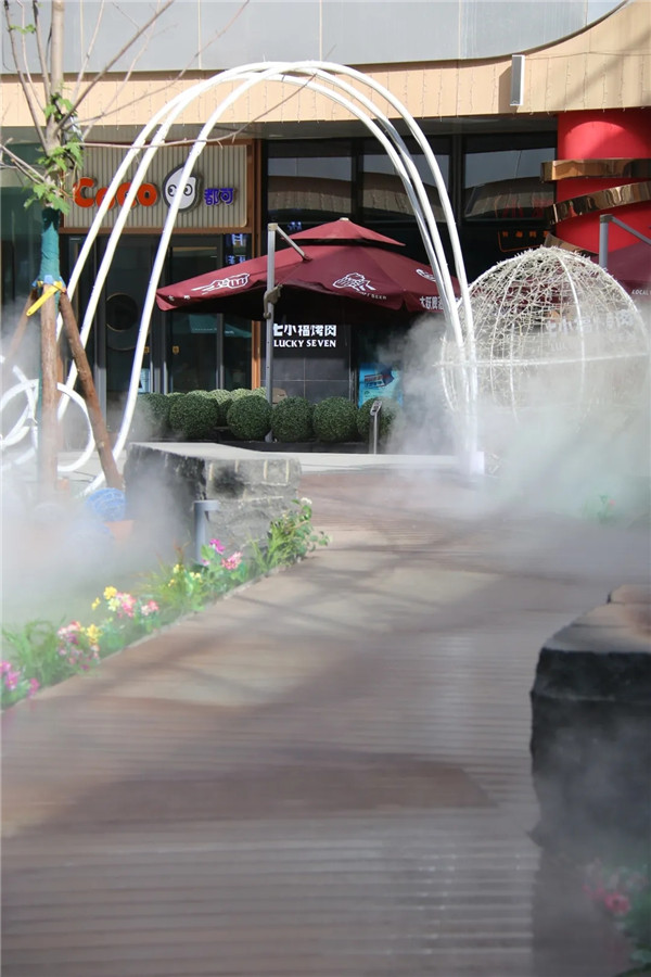 走入街区一团团白色水雾不断弥漫,让人产生腾云驾雾般的奇妙感觉,其实,这是悦界新增的降温装置,每天中午以后,不仅广场中心开始造雾,沿街的商铺廊檐也都全部打开水雾装置,细密的微量水雾从廊檐向下弥漫,沿街铺开整条街就像是置于仙境一般。