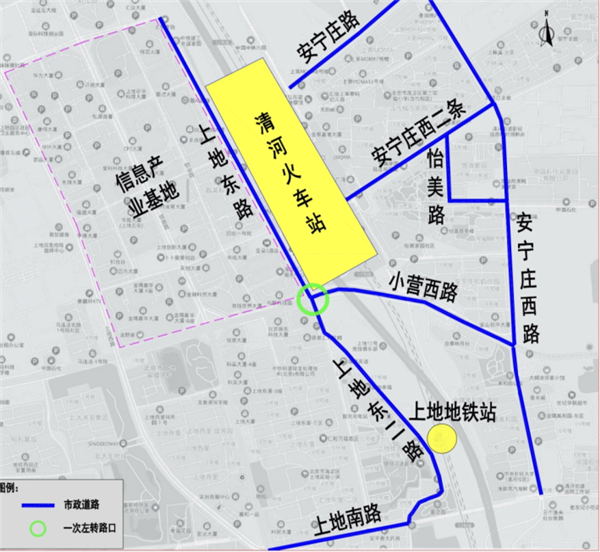 上地东路位于清河高铁站西侧,安宁庄西二条对接高铁站东广场出口,会同已慢行改造完成的高铁站南侧小营西路和东侧安宁庄西路、将要实施的高铁站北侧安宁庄路,共同组成清河高铁站核心慢行网络。