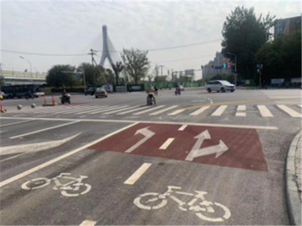 二是在路口范围内设置非机动车彩色铺装,明确非机动车通行范围,保障交通安全。