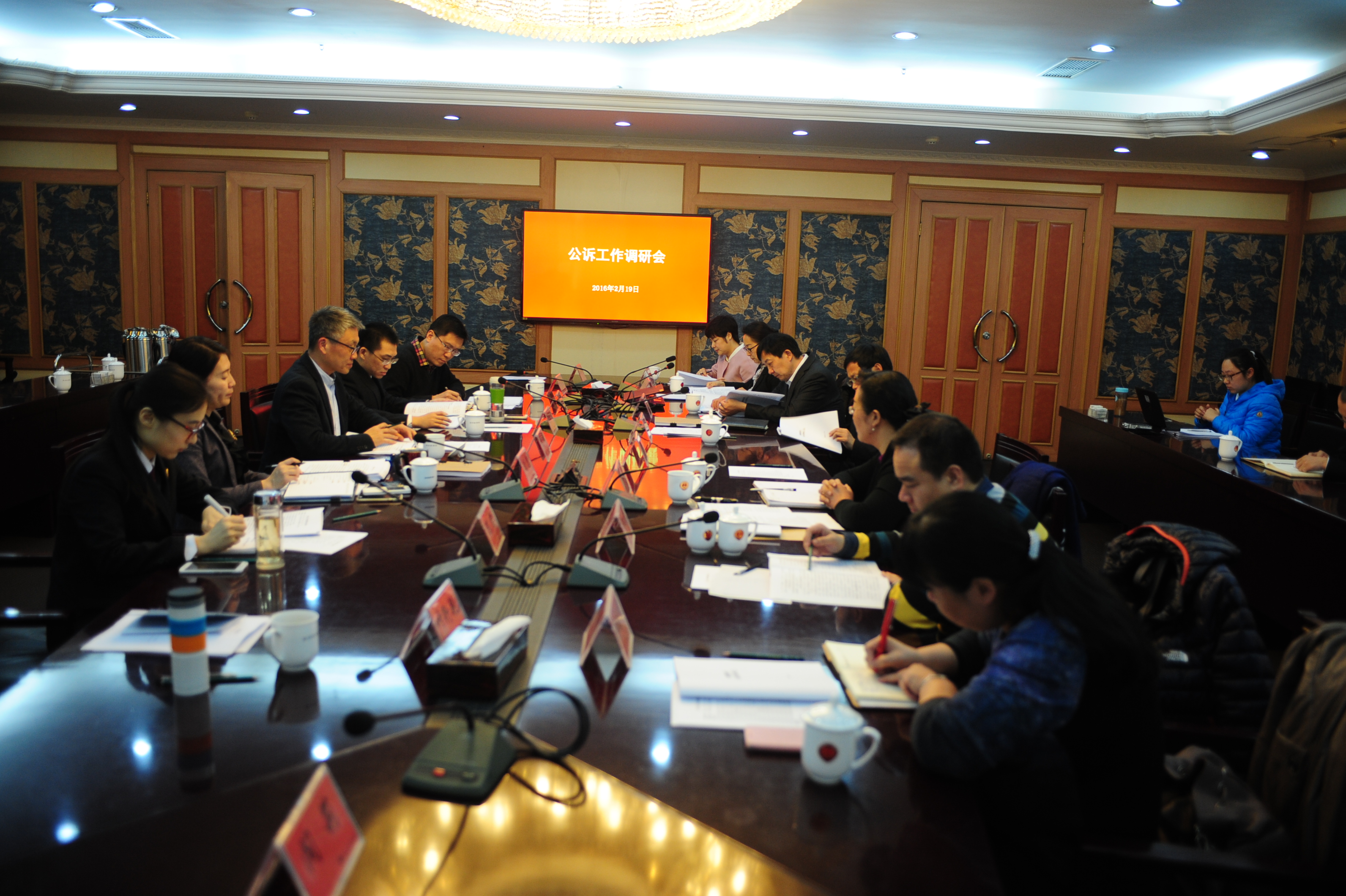 2016年2月19日,最高检公诉厅陈国庆厅长、张相军副厅长一行到海淀检察院就公诉工作进行调研,同时看望了我院公诉干警并听取重点案件办理情况汇报。市检察院苗生明副检察长、我院王伟检察长、刘惠副检察长参加了会议。(撰文:符洪雪;拍摄:刘军)