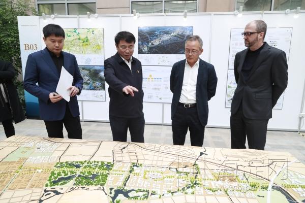 参观期间,于军、戴彬彬详细听取每个参展方案的设计思路介绍,并不时与设计方进行沟通交流,提出意见建议,进一步优化北清路沿线水循环、交通疏导、空间布局、环境提升等方面的设计理念。