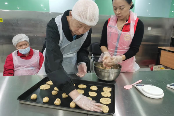 桃酥是一款深受大众喜爱的传统点心,因其酥、脆而闻名。伴随着欢声笑语本次活动正式开始,在志愿者的帮助下大家穿戴好围裙、帽子与手套,由烘培老师指导进行桃酥制作。大家撸起袖子,兴致勃勃地动起手来,共同化身为“糕点大师”;听着焙烘老师的步骤讲解再筛入对应分量的面粉、泡打粉和小苏打,同时加入准备好的核桃仁,大家互相帮助认真用橡皮刮刀翻拌均匀;然后取一小块面团揉成球形,在掌心按压平整,依次摆放在烤盘上,大家分工明确,一盘盘桃酥制作完毕等待烤制。