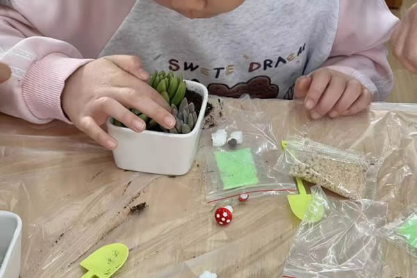 活动现场整齐陈列着形态各异的多肉幼苗、疏松肥沃的营养土、小巧精致的花盆以及彩色铺面石。为让特需儿童和家长们更好地掌握种植技巧,活动专门邀请了专业花艺教师现场指导,考虑到特需儿童的认知特点,教师放慢语速、放慢动作,用通俗易懂的语言、生动形象的演示,耐心讲解,反复示范,确保每个家庭都能听懂、学会。在亲手劳作环节,孩子们专注的眼神、认真的模样,感染着现场的每一个人。他们不仅认识了不同品种的多肉植物,锻炼了动手能力和专注力,更在与家长的互动中,增进了亲子情感联结,感受到了陪伴的温暖。