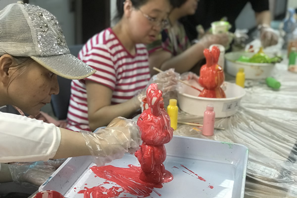 为了愉悦温馨家园日间照料和职康站学员的身心、提高他们的动手能力和艺术素养,近日羊坊店温馨家园为两站学员开展了流体兔DIY手工活动。活动现场,首先任课老师给学员们介绍了色彩搭配知识和颜料用量、倾倒顺序方向及流速把控等使用方法。随后学员们开始发挥天马行空的创意,挑选自己喜欢的颜色进行搭配调和,并搅拌出纹理,再将精心调好的颜料小心翼翼地浇在小兔模型上。颜料慢慢流落汇聚到盘底,再用笔刷或勺子将颜料淋到没有流到的位置。粉嫩可爱的、黑金炫酷的、天蓝治愈的、自带清凉感的薄荷色系,一只只色彩斑斓、风格迥异的流体兔就呈现在大家的眼前。