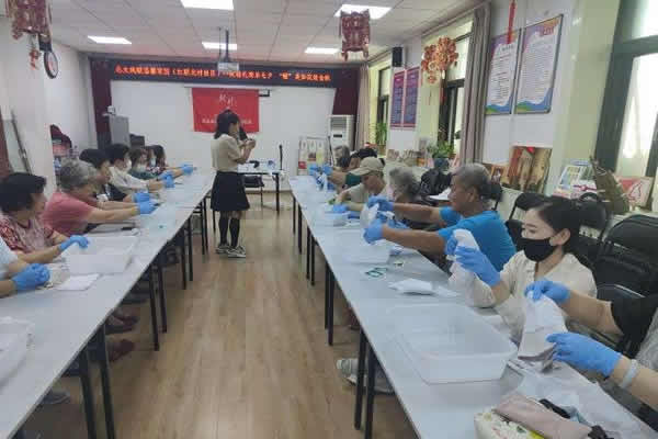 扎染工作结束后,老师还教大家将扎染后的布料缝制成渔夫帽,让大家眼前一亮。在大家的巧手之下,一个个diy个性渔夫帽呈现在眼前。“入秋了,过阵子天凉快了,正好带着渔夫帽出门,太时髦了!!”来自红联北村社区的张阿姨说。
