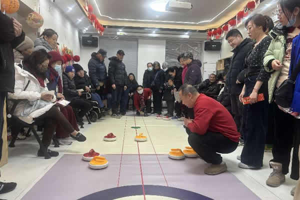 活动现场红灯笼高挂、灯谜彩纸随风摇曳,处处洋溢着团圆祥和的节日氛围。签到入场后,工作人员为每位参与者发放打卡手册,主持人向大家送上元宵祝福,介绍了元宵节猜灯谜、闹花灯的传统习俗,以及本次活动“打卡盖章”的参与规则,即完成四大互动区域体验,即可集齐印章、收获节日纪念,为活动拉开温馨序幕。专业体育指导员随后以“推壶进圈”为核心,用通俗易懂的语言讲解旱地冰壶的简化玩法,重点示范安全推送与瞄准技巧,为体验环节做好铺垫。