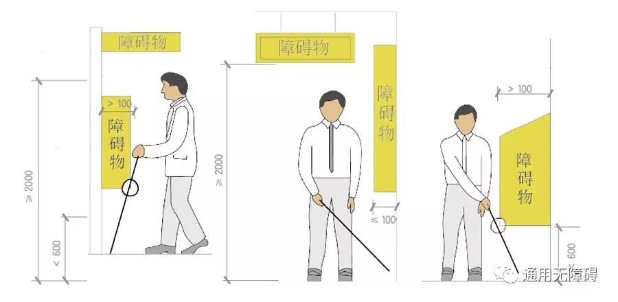4.固定在无障碍通道的墙、立柱上的物体或标牌距地面的高度不应小于2.00m;如小于2.00m 时,探出部分的宽度不应大于100mm;如突出部分大于100mm,则其距地面的高度应小于600mm;