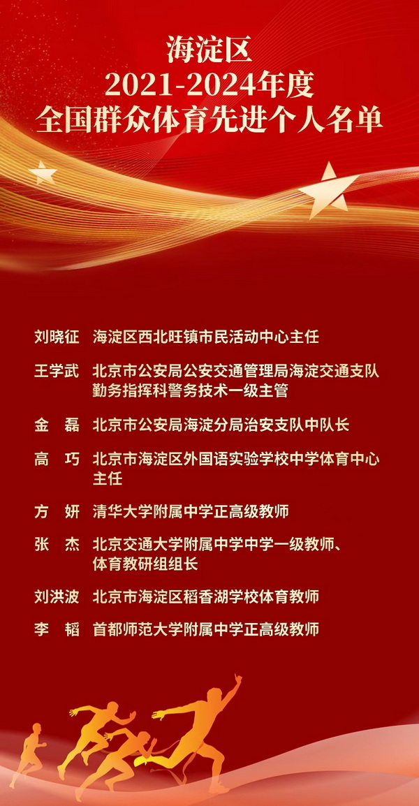 同时,受表彰的8名先进个人,更是全区群众体育工作者的杰出代表,他们来自各行各业,包括海淀区西北旺镇市民活动中心的刘晓征、北京市公安局公安交通管理局海淀交通支队的王学武、北京市公安局海淀分局治安支队的金磊、北京市海淀外国语实验学校的高巧、清华大学附属中学的方妍、北京交通大学附属中学的张杰、北京市海淀区稻香湖学校的刘洪波、首都师范大学附属中学的李韬。他们在大型活动保障、基层体育推广、校园体育教学、体育赛事组织等领域默默奉献,是群众体育事业的坚实基石。