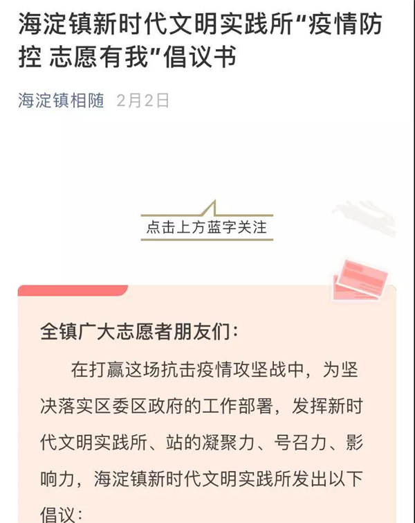 2月2日,海淀镇新时代文明实践所发出了“疫情防控志愿有我”的倡议书,吹响抗疫“集结号”,号召全镇广大志愿者朋友积极行动,共同坚守,用爱筑起抗击疫情的安全防线,守护海淀镇美好幸福的家园,打赢抗击疫情的攻坚战!