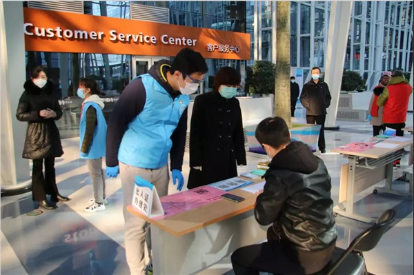 在大厦一层,身着红色马甲的嘉华大厦战旗党支部工作人员和蓝色马甲的贝壳找房抗击疫情志愿服务队的队员们,正在为企业提供防疫服务,引导大家分流排队、填写个人信息。