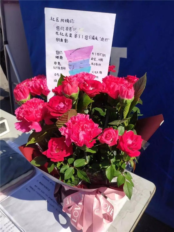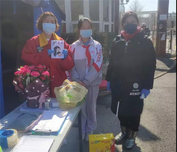 就在前一天,来自社区的中学生陈漫真为表达对社区值守志愿者的感激之情,画了一幅画、写了一封信、送上一束花,她在信中写道,“您们为了我们的健康安全,不顾安危、不计条件、不计报酬,义无反顾守在疫情防控的第一线!在这里向您们致以崇高敬意和诚挚慰问,您们辛苦啦!”这束鲜花照片被王蓓发到朋友圈里,立即成为“网红”。