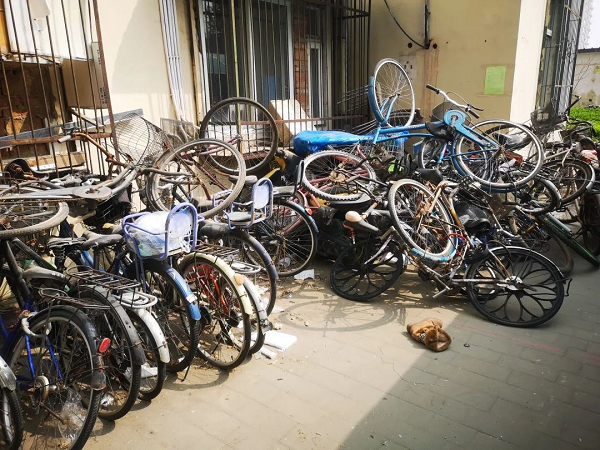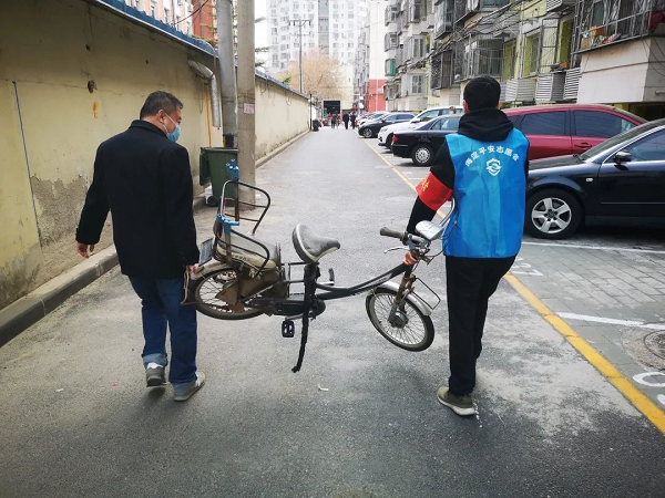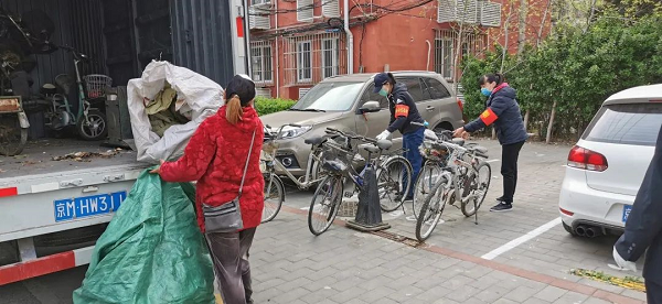 在防控疫情期间,为了让社区环境更加优美、有序。4月7日上午,学院路街道志新社区党委、居委会联合房修一物业公司,在志新北里小区开展废旧自行车清理活动。