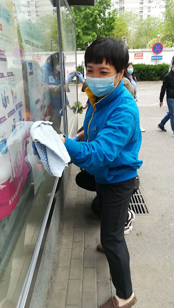 社区橱窗时间一长表面自然就会变得污浊,里面也会有尘土积聚,甚至部分橱窗玻璃表面还会有痰迹、小广告。清理过程中,大家拿着干湿抹布、清洁球、小铲、水盆等工具,有的负责抬着玻璃面,有的负责清理过期海报,有的负责擦拭,而面对大块儿痰迹,大家先是进行消毒,然后剪下小块毛巾进行擦拭,最后进行再次消毒。清洁中体现着疫情期间防控工作的落实。最难处理的还是活动室外面玻璃的粘胶大海报,胶劲大,处理面积大,所以耗时就会很长,有的人说到:“处理这个得需要一下午的时间。”李艺光说:“咱们就要彻底清理干净,不拿下它不罢休,一定要有攻坚精神。”这句话激励了在场所有人员。在大家轮番不休的攻势下,历经近一小时,海报被成功清除,玻璃呈现出往日的洁净。