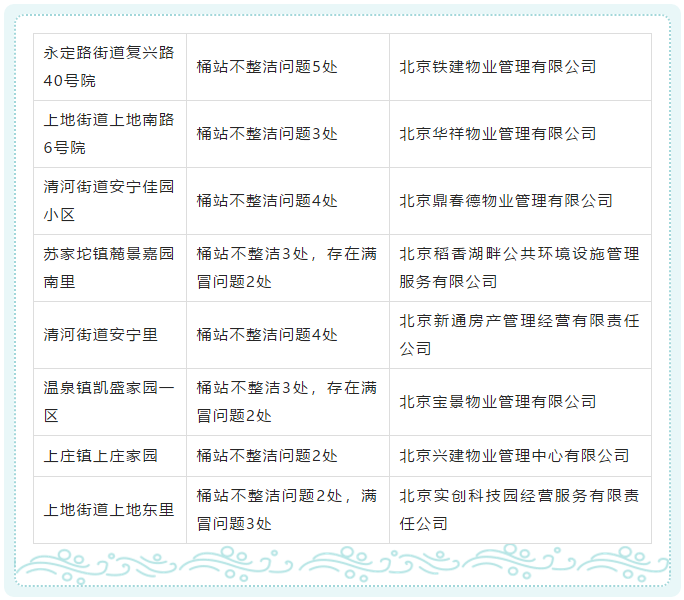 近期,在海淀区房管局垃圾分类检查中,大部分物业项目垃圾分类较好,但在本周海淀区生活垃圾分类推进工作指挥部专项检查中,仍有部分居住类物业项目存在厨余垃圾混装混运、桶站不整洁及垃圾满冒问题。