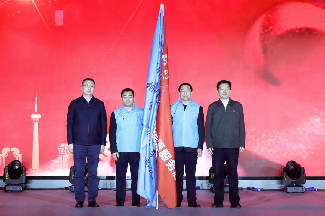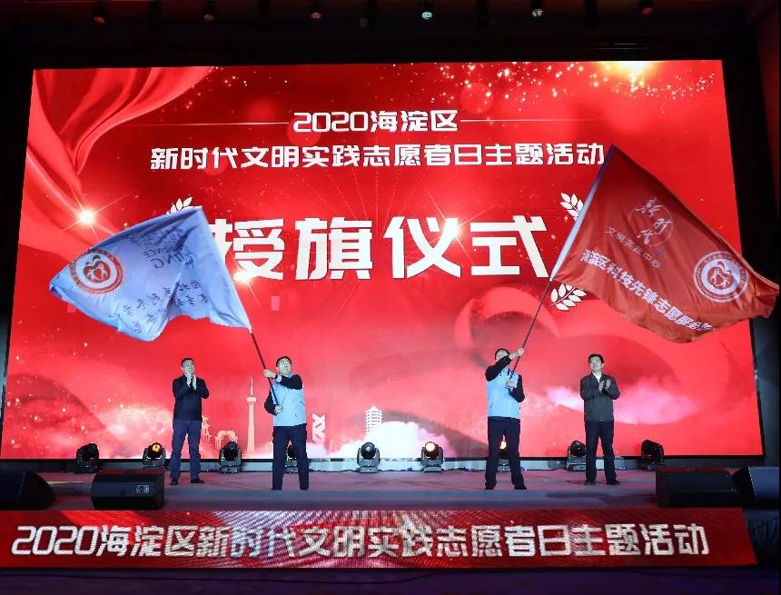 ▲海淀区委副书记张强,区委常委、宣传部部长张劲林为新成立的两支志愿服务总队授旗。