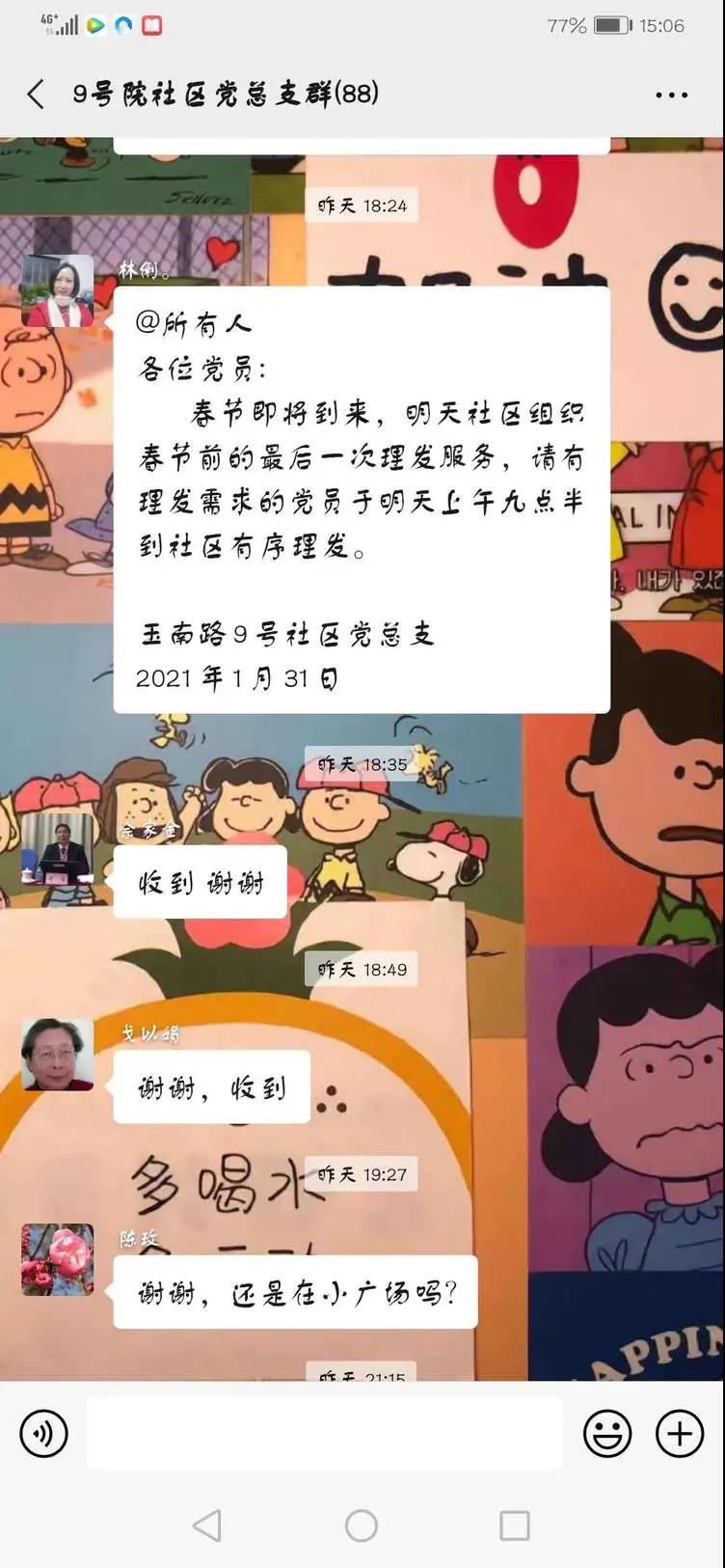 每月一次的理发,形成了社区特色,月初的前一天林书记会把理发信息发到志愿者群里,大家踊跃报名积极响应。