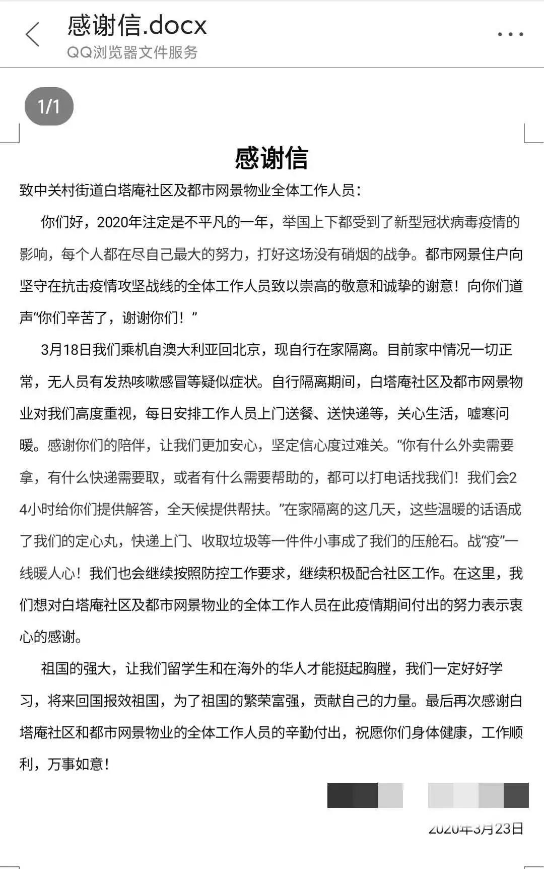 为社区和物业送上了电子版的感谢信