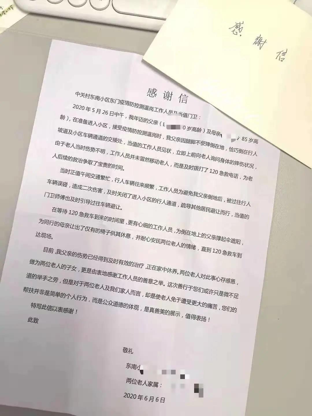 一位老爷子摔倒在社区路上了,科育社区的居干司哲首先发现紧急情况,马上叫上孙姌苒、胡扬抵达现场询问老爷子身体情况及家庭住址。得知老爷子是新科祥园居民,他们立刻通知了新科社区,副主任张镫元急忙赶往现场,同时联络家属,家属到达后,安抚了老人的情绪在确定老人身体已无大碍的前提下共同扶着老爷子回到家中,待老爷子平稳后元元才准备离开。家属在社区群和业主群里为社区发来了感谢信,感谢社区同志们全程无私的帮助,老爷子一直感慨:还是好人多啊!