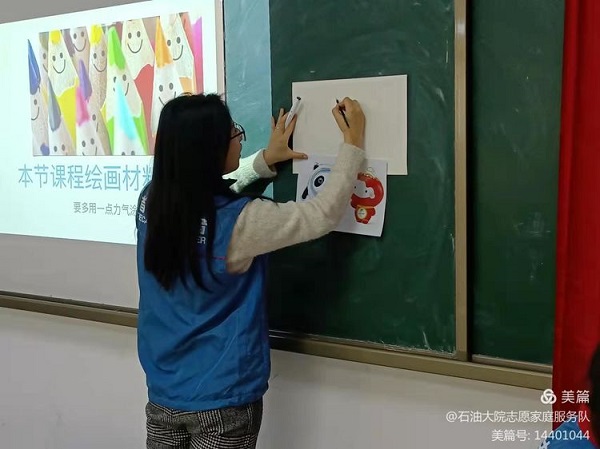 12月11日早上8:30,4位志愿者老师早早地赶到教室,整理桌椅、签到、削铅笔,迎接大家的到来。9点整活动正式开始,来自祯雨学苑的美术老师王烨如,开始给大家讲述冬奥会运动项目,认识各种各样的冬奥会元素,指导大家如何画好冬奥会吉祥物冰墩墩和雪容融,并让孩子们充分发挥自己的想象力,融合冬奥会相关元素进行创作。